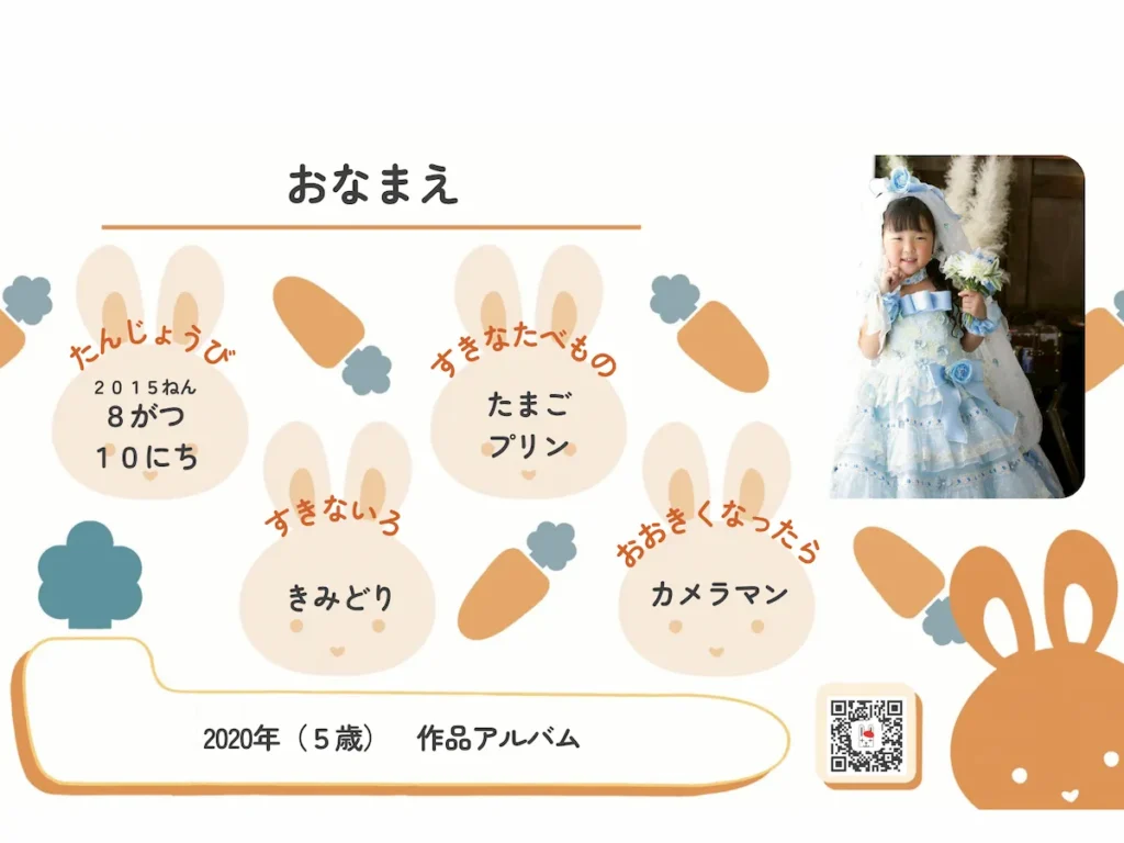 本の1ページ目には、この作品集の作者(アーティスト)であるお子さまのプロフィールが入ります。